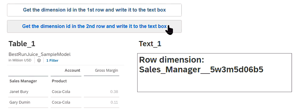 The top button retrieves the dimension id from row 0 & writes it to the text box: Text_1.applyText(“Row dimension: ” + rowDims[0]);